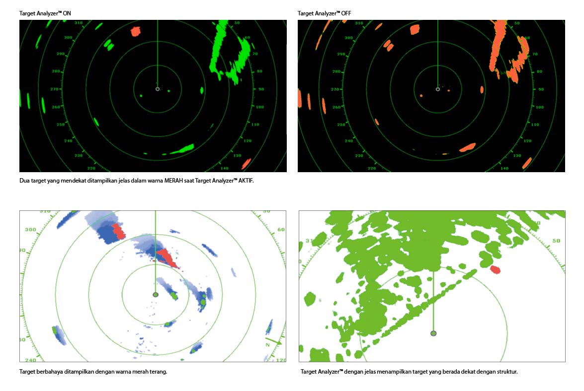 Seri NXT adalah radar pertama di dunia yang menggunakan fungsi eksklusif FURUNO, yaitu Target Analyzer™. Target yang mendekati kapal Anda secara otomatis berubah warna untuk membantu mengidentifikasi potensi bahaya. Echo berwarna hijau menunjukkan target yang diam atau menjauh dari Anda, sementara echo berwarna merah menandakan target berbahaya yang bergerak mendekat. Echo akan berubah warna secara dinamis sesuai dengan pergerakan target, apakah semakin dekat atau semakin jauh dari kapal Anda. Target Analyzer™ meningkatkan kesadaran situasional dan dapat meningkatkan keselamatan dengan menunjukkan target mana yang perlu Anda waspadai.”